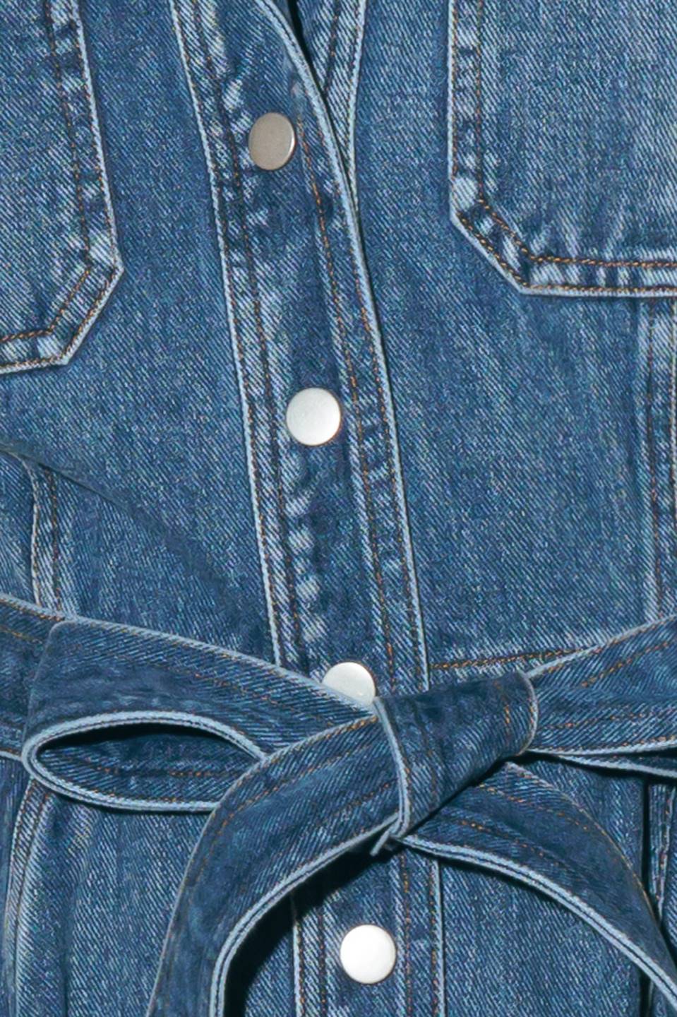 A washed denim midi dress featuring collar, short sleeve, front and side pockets, button down and self-sash tie.